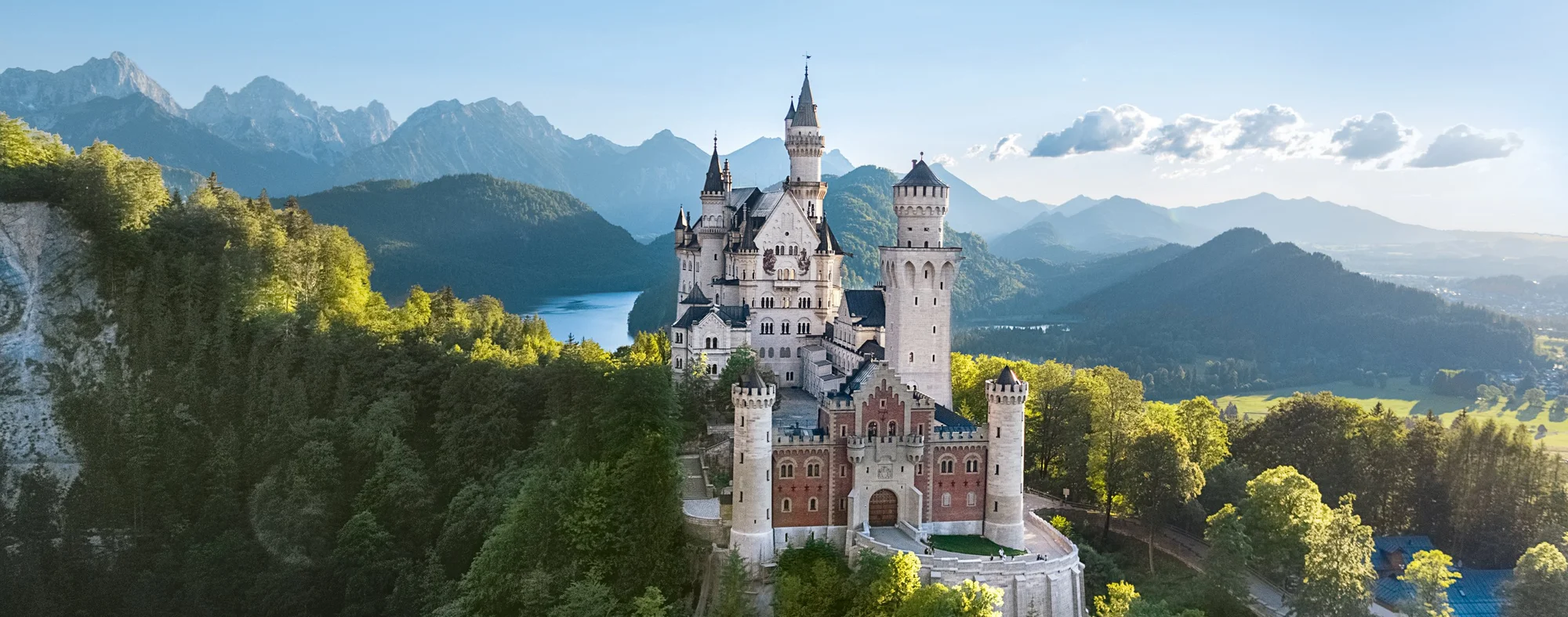 Neben dem Brandenburger Tor ist Schloss Neuschwanstein eines der bekanntesten Wahrzeichen Deutschlands. Auf einem Felsvorsprung gelegen begeistert das Schloss mit seiner märchenhaften Architektur aus verspielten Türmen, kunstvollen Fassaden und prunkvollen Innenräumen.