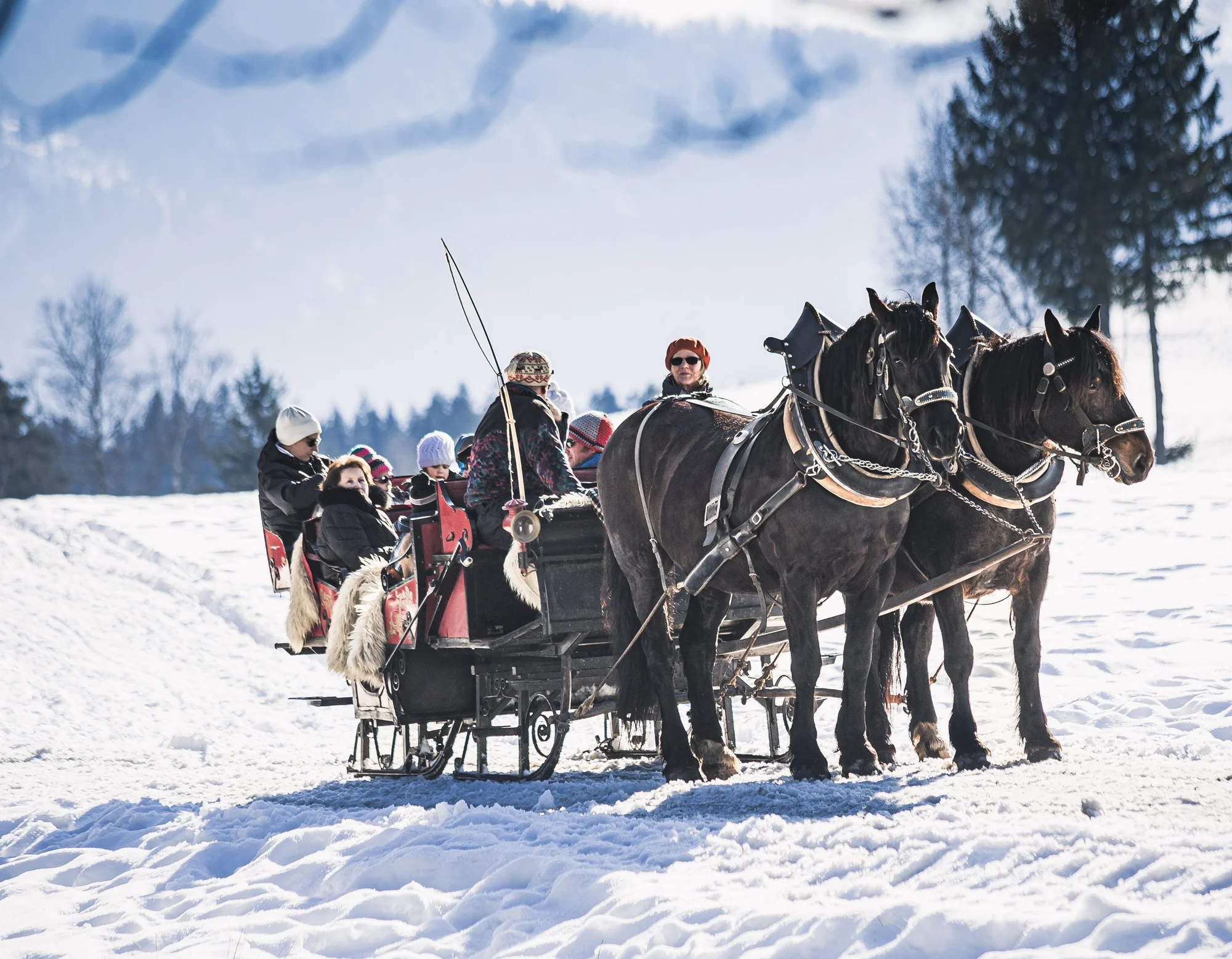 Entdecken Sie bei einer Pferdeschlittenfahrt die verschneite Landschaft rund um Schwangau. Wenn Sie Entspannung suchen, finden Sie diese in der Kristall Therme Schwangau mit Blick auf die Königsschlösser und umliegenden Berge.